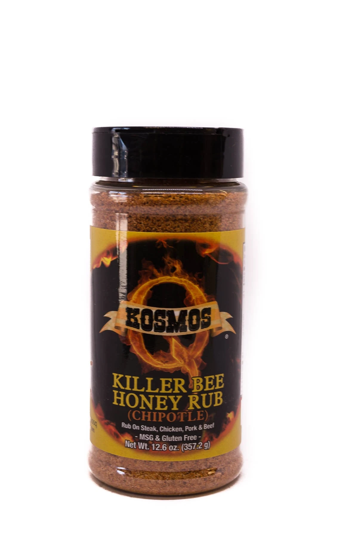 We took our sweetest honey rub and added fiery chipotle to make it a beautiful contradiction of sugar, spice and everything nice. If your taste buds can handle being deliciously confused, then it goes great on just about any meat you could possibly imagine! Kosmo’s Spicy Killer Bee Rub promises that you’ll be the talk of the ‘Q no matter who’s tasting.(MSG & Gluten Free)