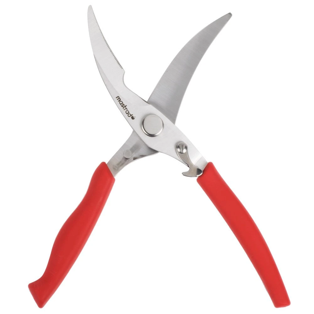 Effortlessly cut through chickens, ducks, turkeys, and even pizzas with these Mastrad A24315 9 1/2″ poultry and pizza shears! These versatile shears boast 5 1/2″ long, curved blades for simple cutting, while their reinforced high-quality stainless steel design ensures long-lasting performance. One of the blades is straight and the other is serrated to provide added traction when cutting through thick bones. This also helps cut through crisp pizza crusts in one quick pass to give customers a clean cut instead of the uneven cuts that can results from the back-and-forth rolling of a traditional pizza wheel!