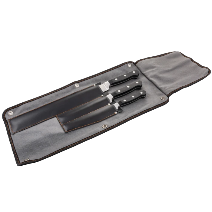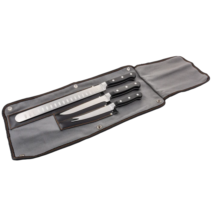 The Oklahoma Joe’s® Blacksmith 3-Piece Knife Set offers the reliability and versatility necessary to trim, slice and more when prepping for your next smoke. All knives feature a full-tang, single blade varying in thickness and edging. Supported by a thick bolster and riveted construction, you can count on these knives to cut your meat with ease, before, during and after your smoke. Includes a protective knife roll.