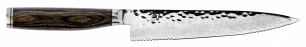 The Shun Premier Serrated Utility Knife is part of the beautiful Shun Premier line, which calls to mind the hand-forged knives of ancient Japan. While each knife still takes at least 100 handcrafted steps to complete, the materials Shun uses are among the most advanced in the industry. Each blade has a cutting core of Shun’s proprietary VG-MAX “super steel” to take and hold a precision edge. The layered Damascus cladding supports the core and provides additional stain resistance. Near the edge of the blade, where the steels meet, an undulating line is formed—similar to the hamon formed when samurai swords are tempered using a traditional clay-baking technique. The hammered tsuchime finish acts like a series of hollow-ground cavities to reduce drag. The handles nestle comfortably in the hand, while the embossed end cap adds balance and beauty.