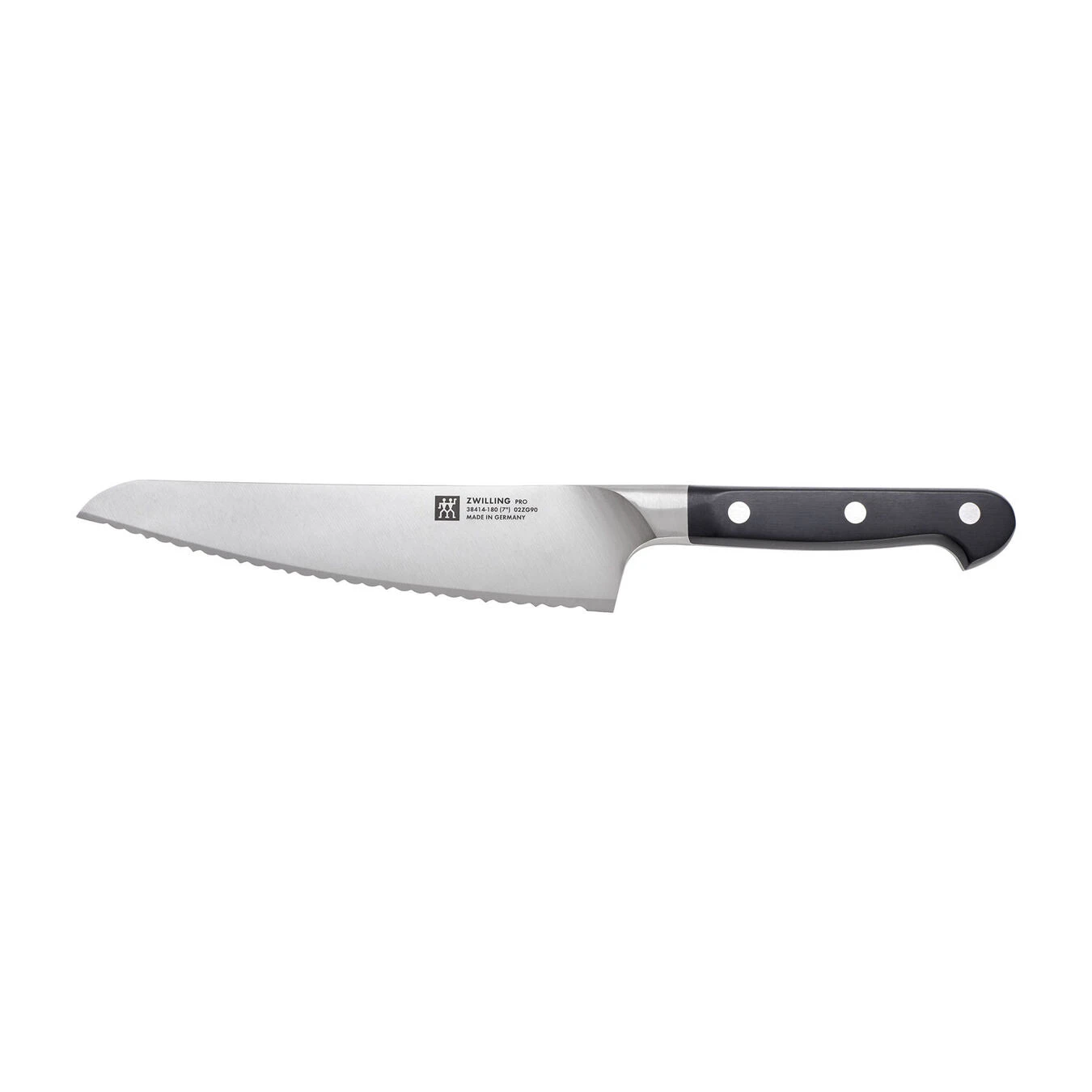 Designed to provide increased knuckle clearance from the cutting board, the ergonomic, triple-rivet handle and tang provide comfort and stability as you cut through hearty foods. The German-made 7-inch blade is curved for nimble and precise cutting while the unique Z-15.1 serration designed by ZWILLING provides clean and controlled slicing and stays sharper, longer.
