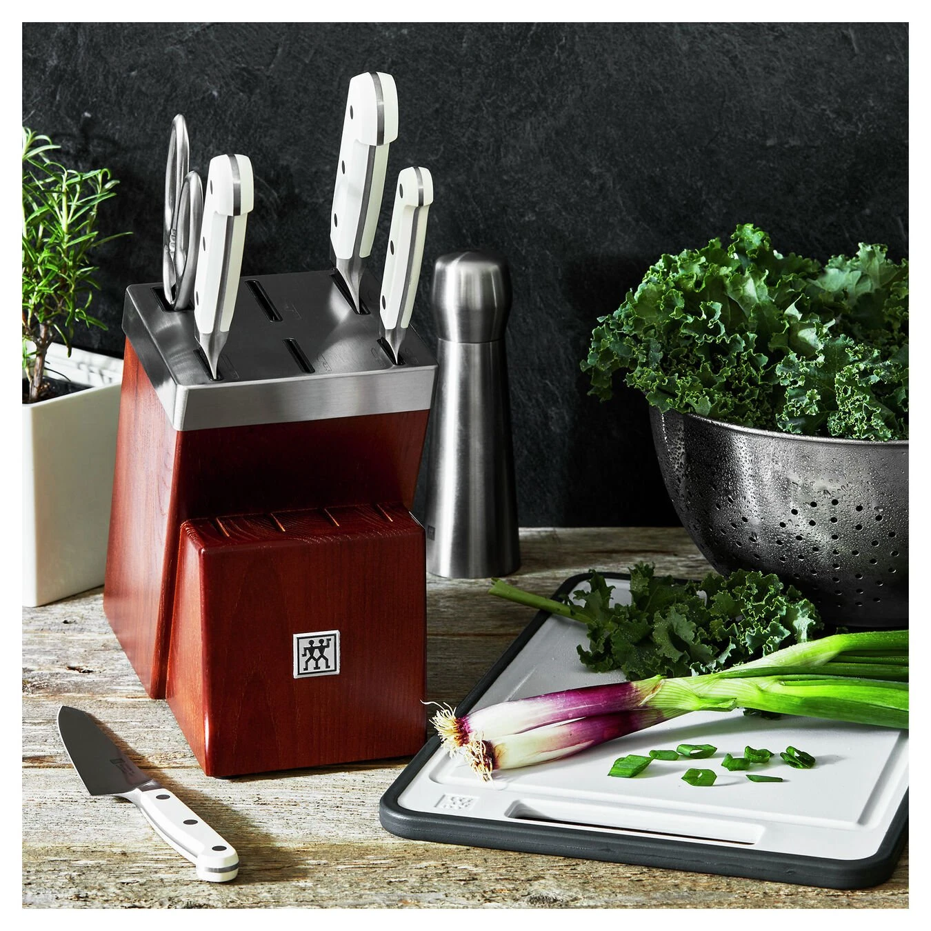 As the modern kitchen specialist, ZWILLING J.A. Henckels makes premium products that enhance the lives of professional and home chefs worldwide. Born from 287 years of cutlery expertise, the ZWILLING Pro Self-Sharpening Knife Block is stocked with all you need to slice, sharpen, and store. Its self-sharpening slots boast built-in ceramic honing wheels that automatically sharpen each time a knife is removed or replaced. This Keep It Sharp (KIS) technology ensures your knives are always on the ready for precision prep work. Fully-loaded with 4 essential knives, shears, and a cutting board, this block sets you up to tackle your everyday kitchen tasks with ease. ZWILLING Pro are the most user-friendly knives on the market. Precision-forged from a single piece of special formula stainless steel, they boast an innovative curved bolster that acts as an extension of the hand—allowing you to comfortably cut with confidence.